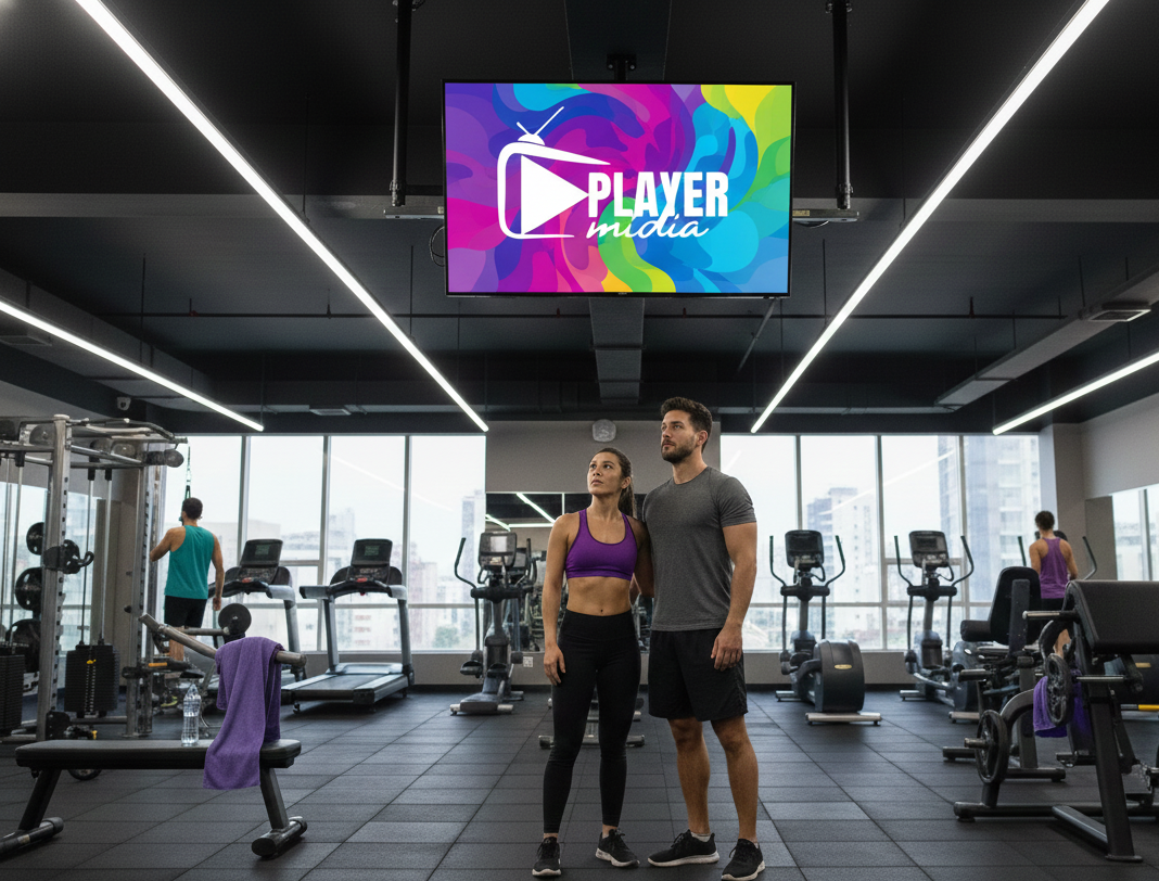 As telas da TV PLAYER MÍDIA estão presentes nas principais academias da cidade, apresentando conteúdo relevante e oportuno para os praticantes de atividade física.